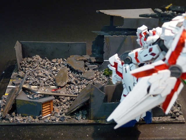 Anyway, the diorama depicts two mobile suits in combat, the unicorn retreating from the slashing sabers of the kshatriya. So the winning mobile suit is the beast.